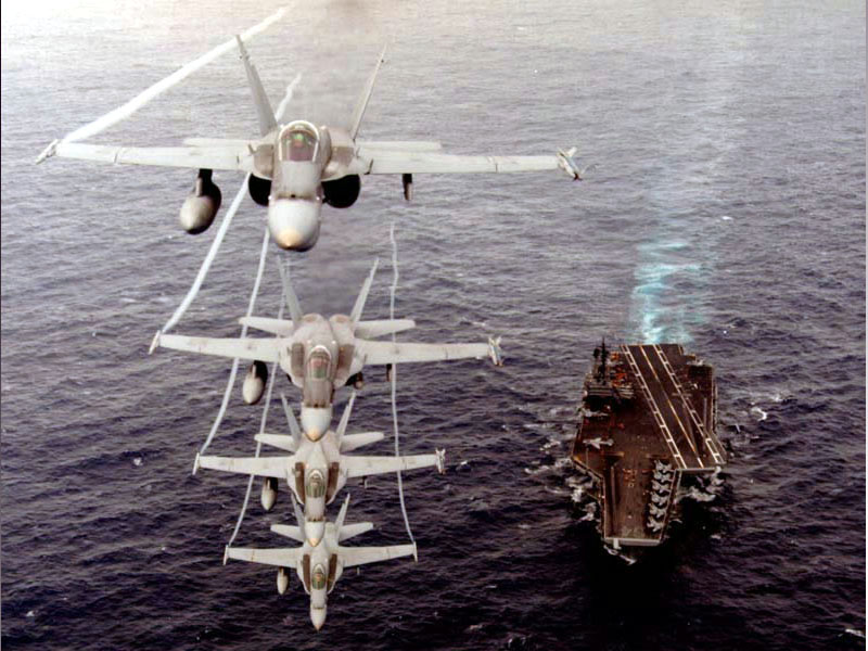 Division of F/A-18C Hornets over the USS Constellation (CV-64). (US Navy photo) |